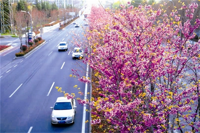 3月31日,仰韶大道湖滨区至陕州区段绵延21公里的路段,紫荆花盛开,一片紫色的海洋。南来北往的车辆穿行花海之间,宛如行在画中。