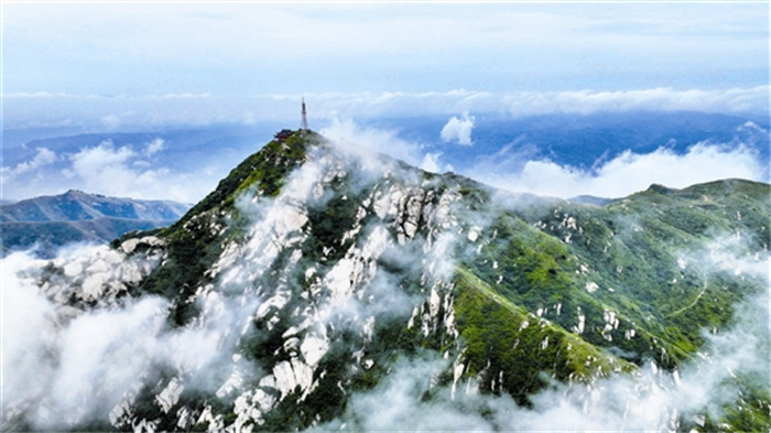 7月4日,微雨过后的灵宝市娘娘山景区,层层云海飘浮在峰林间,时隐时现,宛若仙境。
