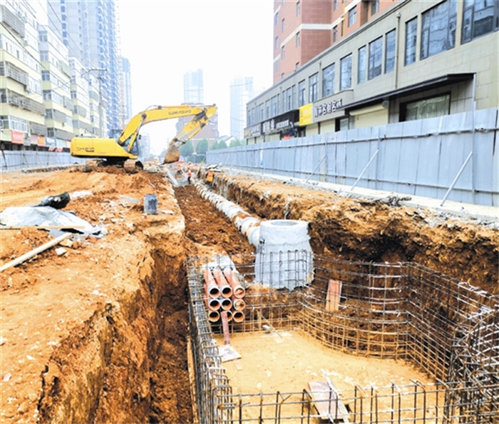 连日来,在渑池县城区中央公园附近,市政人员加紧铺设电力网管,源源不断的电力将通过电网输送到城市的每个角落,惠及千家万户。图为7月14日,市政人员正在紧张施工。