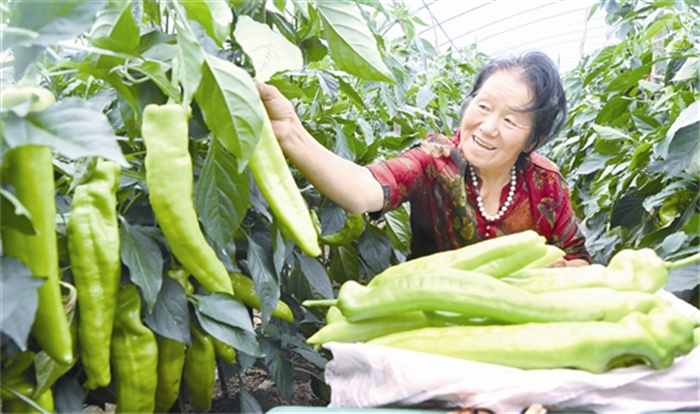 8月15日,在灵宝市苏村乡郭家岭村,菜农阴青霞在自家承包的蔬菜大棚里采摘辣椒。