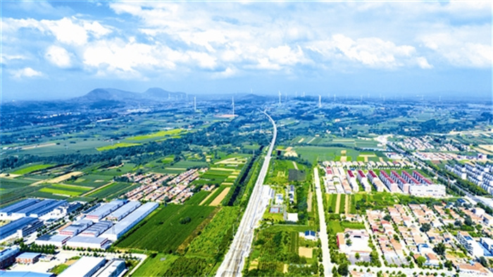 8月27日,航拍下的渑池县果园乡,错落有致的村庄与农田、道路、风力发电机组及葱郁青山等相映成趣,构成了一幅美丽乡村画卷。