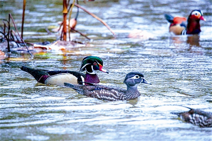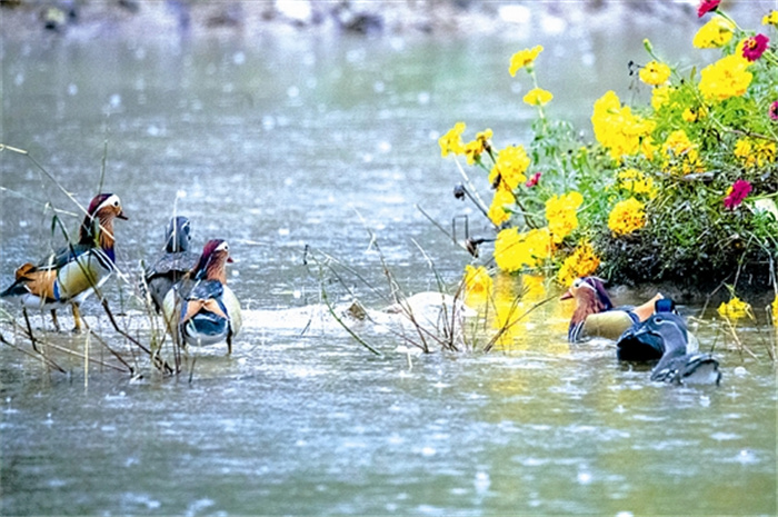11月16日,在卢氏县范里镇新庄村,成群的鸳鸯在嬉戏觅食。