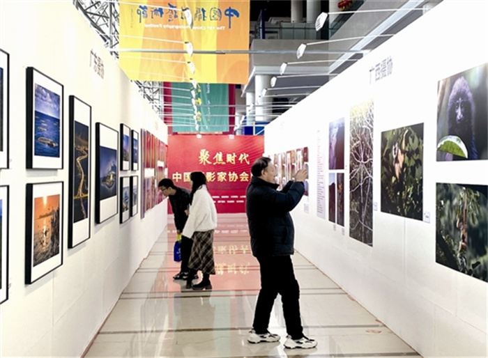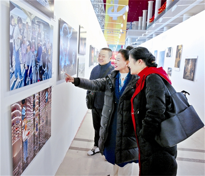 下图:第十五届中国摄影艺术节摄影展在我市持续掀起热潮,精美的摄影艺术作品和高规格的布展设计吸引了大批市民游客前往观展。图为12月7日,市民游客在三门峡国际文博城展厅欣赏摄影作品,接受文化艺术熏陶。