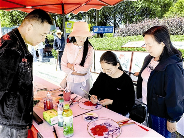 5月1日,在渑池县万人广场,该县美术协会珍墨阁书画院老师现场指导学生作画,从画牡丹浅谈美术艺术,传承非遗文化,让群众在家门口尽享“画花世界”。