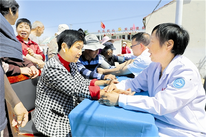 今年以来,市城乡一体化示范区(高新区)中医院(阳店镇卫生院)利用辖区乡村集会、庙会等节会,组织医务人员为群众开展义诊活动,贴心为居民服务。图为该院医生利用庙会为群众进行检查。