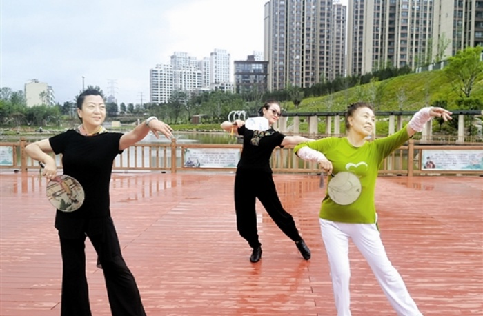 6月14日,夏雨初歇,空气清新。在三门峡市区一公园湖畔,三门峡市吉祥舞蹈队的三位队员认真练习新编的古典团扇舞《寻遍千万只为你》,吸引了公园内的游客驻足、观赏。