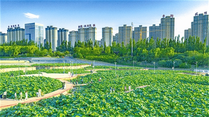 6月27日傍晚,涧河公园荷花盛开,吸引众多市民和游人前来赏花纳凉。