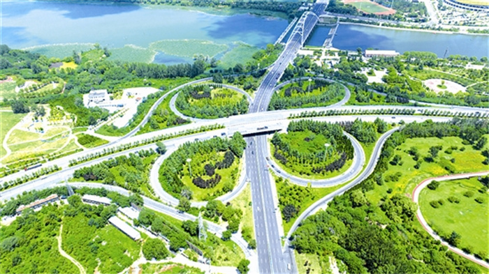 7月23日,三门峡市区金昌互通与碧水绿地相互映衬,构成一幅生机盎然的城市画卷。