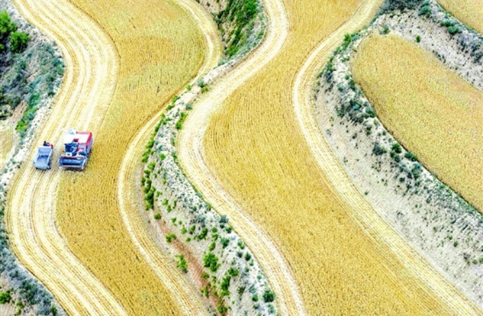 村民驾驶收割机在山坡梯田收割小麦。