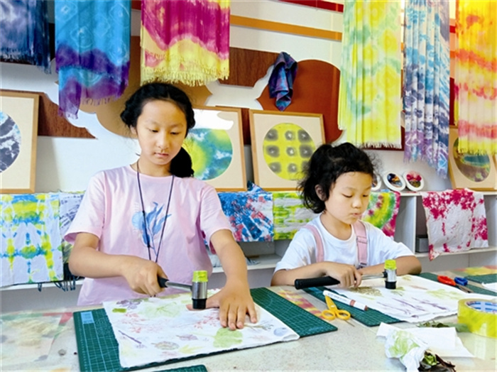 7月18日,在湖滨区青少年活动中心公益课堂,两名学生正在体验传统非遗“捶草印花”手工艺课程。近日,湖滨区青少年活动中心公益课堂结合学生课外兴趣培养需求,开设书法、绘画、益智手工、布艺、沙画、非洲鼓等活动课程,进一步提高青少年艺术素养,丰富学生暑期精神文化生活。