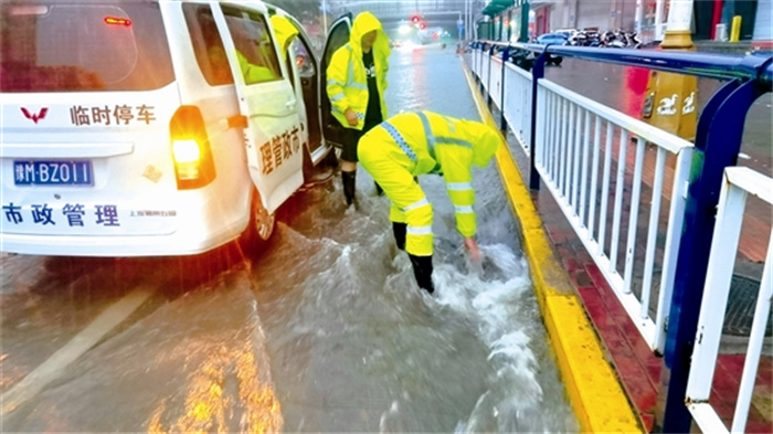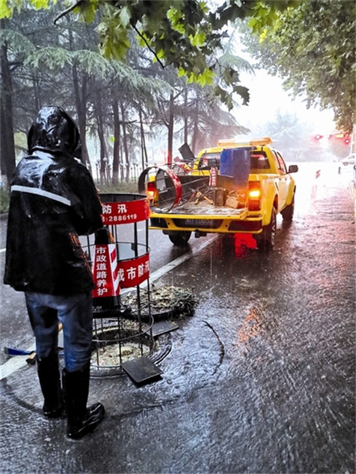 7月29日早上,我市出现短时强降雨,市城市建设发展服务中心组织工作人员及时对主城区易积水路段进行防汛抢险作业,全力保障群众出行安全。