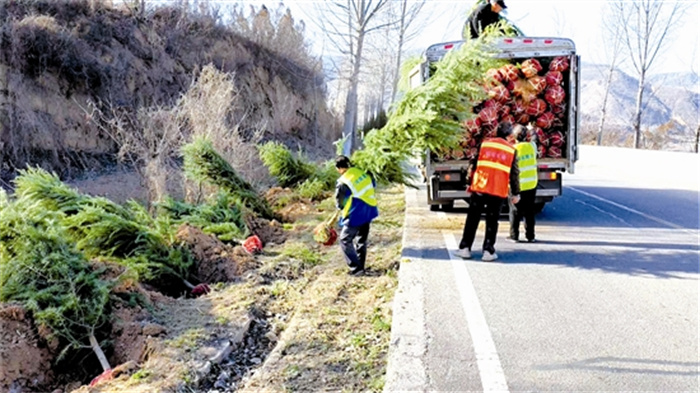 近期,陕州区公路养护部门结合前期对辖区绿地的缺株情况及空白路段的摸底,科学制定绿化提升补植方案,按照标准化原则,陆续进行绿化补植工作。图为3月20日,养护人员搬运苗木,在省道313西线进行绿化补植。