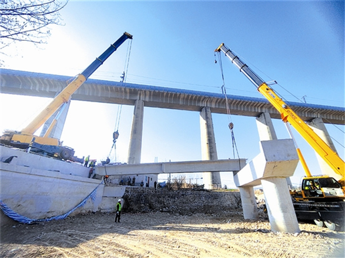 3月21日上午9时,随着第一段现浇梁起吊安装,标志着G209线尤湾桥施工改造项目进入盖梁安装施工阶段,为该桥完成通车奠定了坚实基础。据了解,本次改造为旧桥拆除重建,新建桥梁全长106米、宽13.5米,桥墩立柱6根,浇筑盖梁16个,桥面铺装双层钢筋网混凝土,2024年7月5日开始全封闭施工。