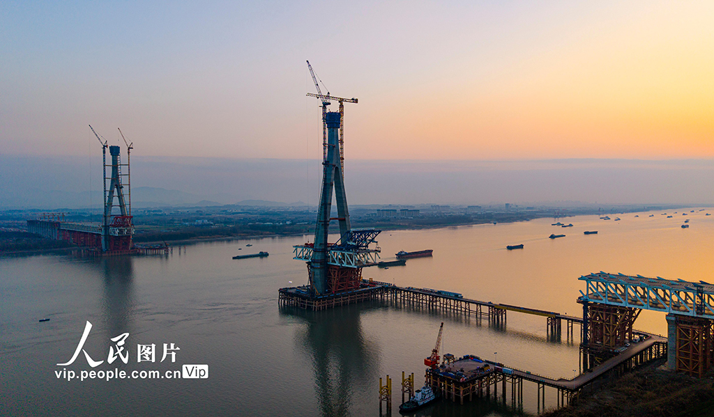 安徽枞阳:池州长江公铁大桥施工正酣