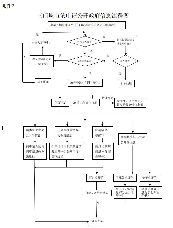 2.处理。本机关对收到政府信息公开申请,能当场答复的,应当场予以答复;不能当场答复的,应该在收到申请之日起20个工作日内予以答复;如需延长答复期限的,经政府信息公开工作机构负责人同意,并告知申请人,延长答复的期限最长不得超过20个工作日。