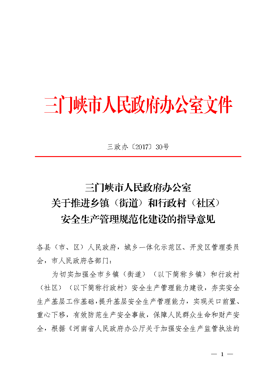关于推进乡镇(街道)和行政村(社区)安全生产管理规范化建设的指导意见(三政办〔2017〕30号)