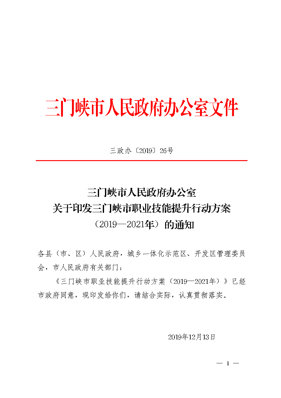 三门峡市人民政府办公室关于印发三门峡市职业技能提升行动方案(2019—2021年)的通知(三政办〔2019〕26号)