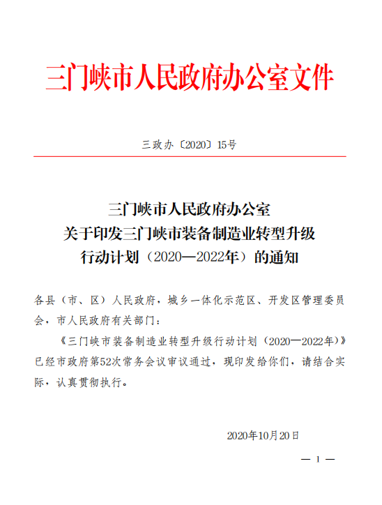 三门峡市人民政府办公室关于印发三门峡市装备制造业转型升级行动计划 (2020—2022年)的通知