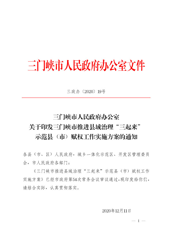 三门峡市人民政府办公室关于印发三门峡市推进县域治理“三起来”示范县(市)赋权工作实施方案的通知
