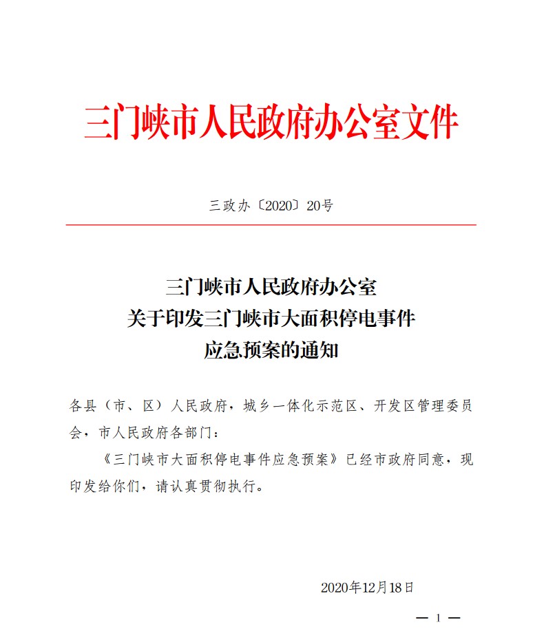 三门峡市人民政府办公室关于印发三门峡市大面积停电事件应急预案的通知