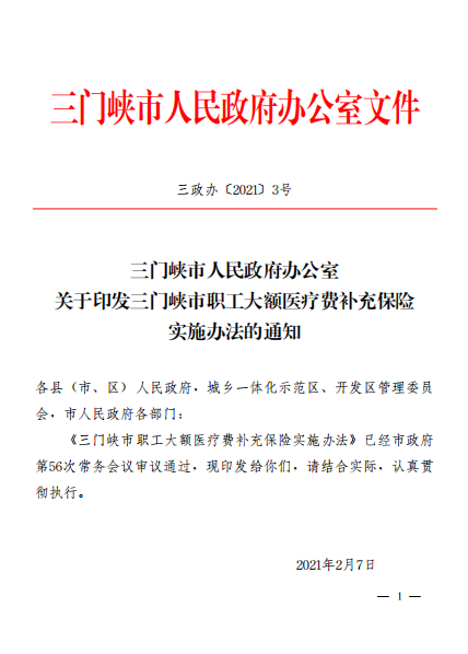 三门峡市人民政府办公室关于印发三门峡市职工大额医疗费补充保险实施办法的通知