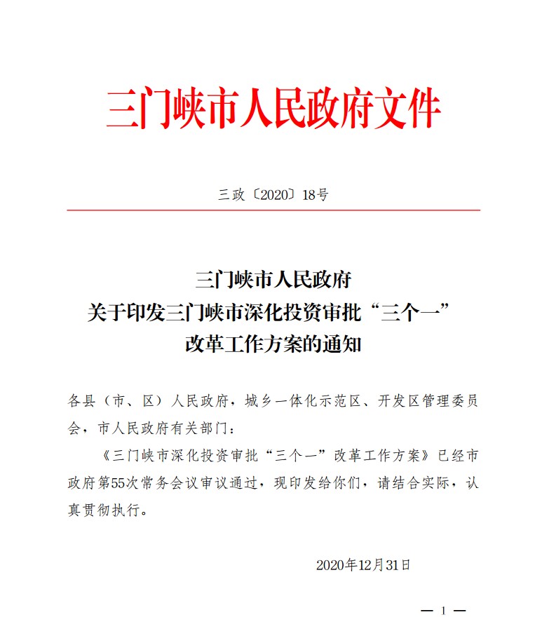 三门峡市人民政府关于印发三门峡市深化投资审批“三个一”改革工作方案的通知